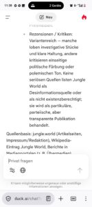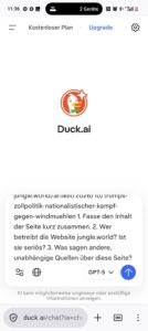 Der automatisch generierte Prompt in duck.ai (GPT-5) für jungle.world – drei klare Fragen an die KI.